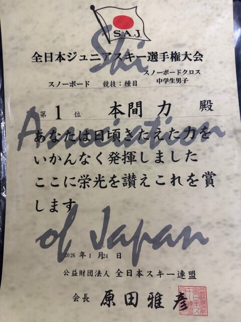 またまたうれしいご報告です。弊社のライダーである本間力君が、SAJの全日本ジュニア選手権(スノーボードクロス)U15